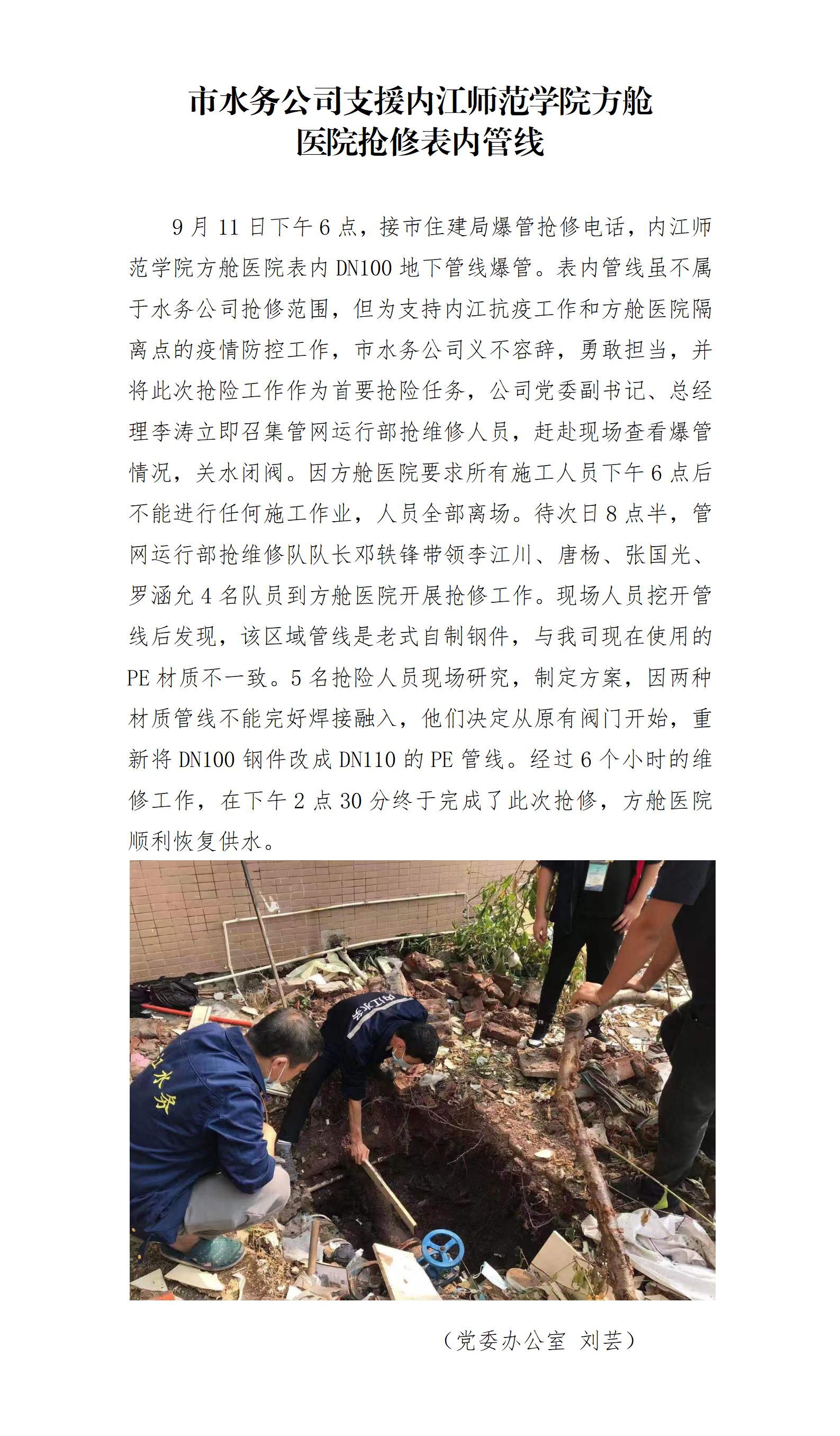 市水務公司支援內(nèi)江師范學院方艙 醫(yī)院搶修表內(nèi)管線