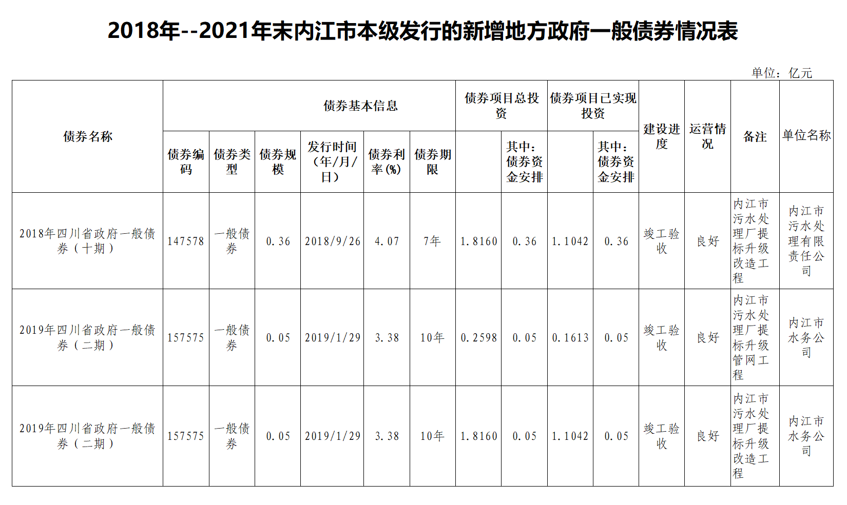 2018年--2021年末內(nèi)江市本級發(fā)行的新增地方政府一般債券情況表