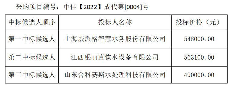 內(nèi)江市水務有限責任公司東湖御景小區(qū)集中式管道直飲水成套設備及附件采購(含安裝)項目評標結(jié)果公示
