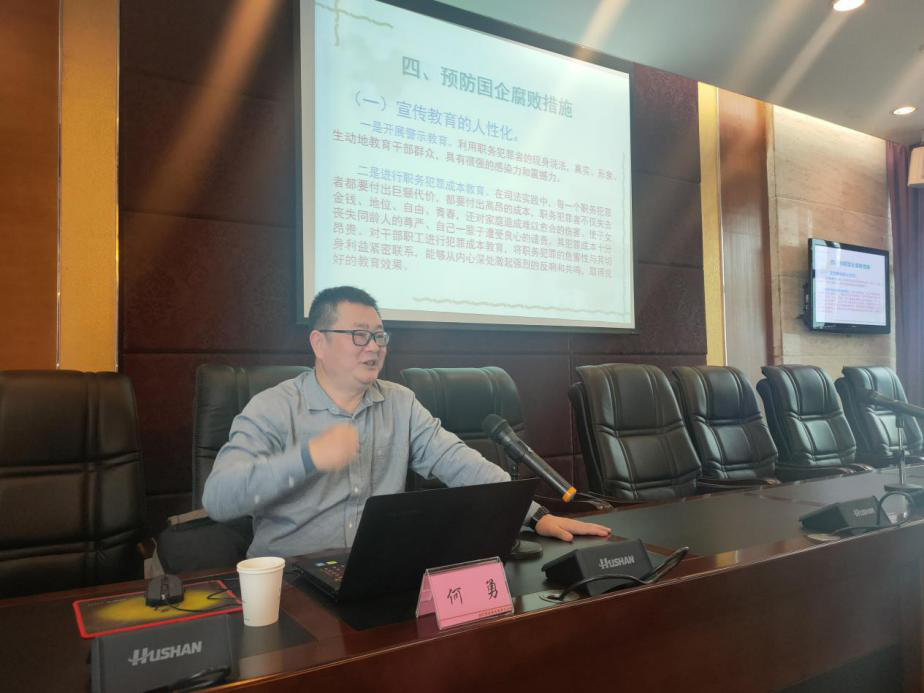 講座上,何勇以“國有企業(yè)預(yù)防腐敗實(shí)踐探索”為題,從建國以來反腐敗歷史的簡要回顧、當(dāng)前國企領(lǐng)域反腐敗的形勢(shì)、水務(wù)企業(yè)違紀(jì)違法典型案例、預(yù)防國企腐敗措施四個(gè)方面,剖析腐敗根源,深入淺出地將國有企業(yè)預(yù)腐防變工作做了詳細(xì)的梳理和講解,具有很強(qiáng)的教育性和警示性。公司黨委副書記、總經(jīng)理李濤結(jié)合講座內(nèi)容,對(duì)進(jìn)一步抓好黨風(fēng)廉政工作提了四點(diǎn)要求:一是要強(qiáng)化政治定力;二是要抓實(shí)紀(jì)法學(xué)習(xí);三是要堅(jiān)持嚴(yán)于律己;四是要自覺接受監(jiān)督。李濤強(qiáng)調(diào),講座的目的在于進(jìn)一步提高干部職工對(duì)黨風(fēng)廉政建設(shè)重要性的認(rèn)識(shí),切實(shí)加強(qiáng)廉潔自律教育,將黨風(fēng)廉政建設(shè)不斷引向深入。