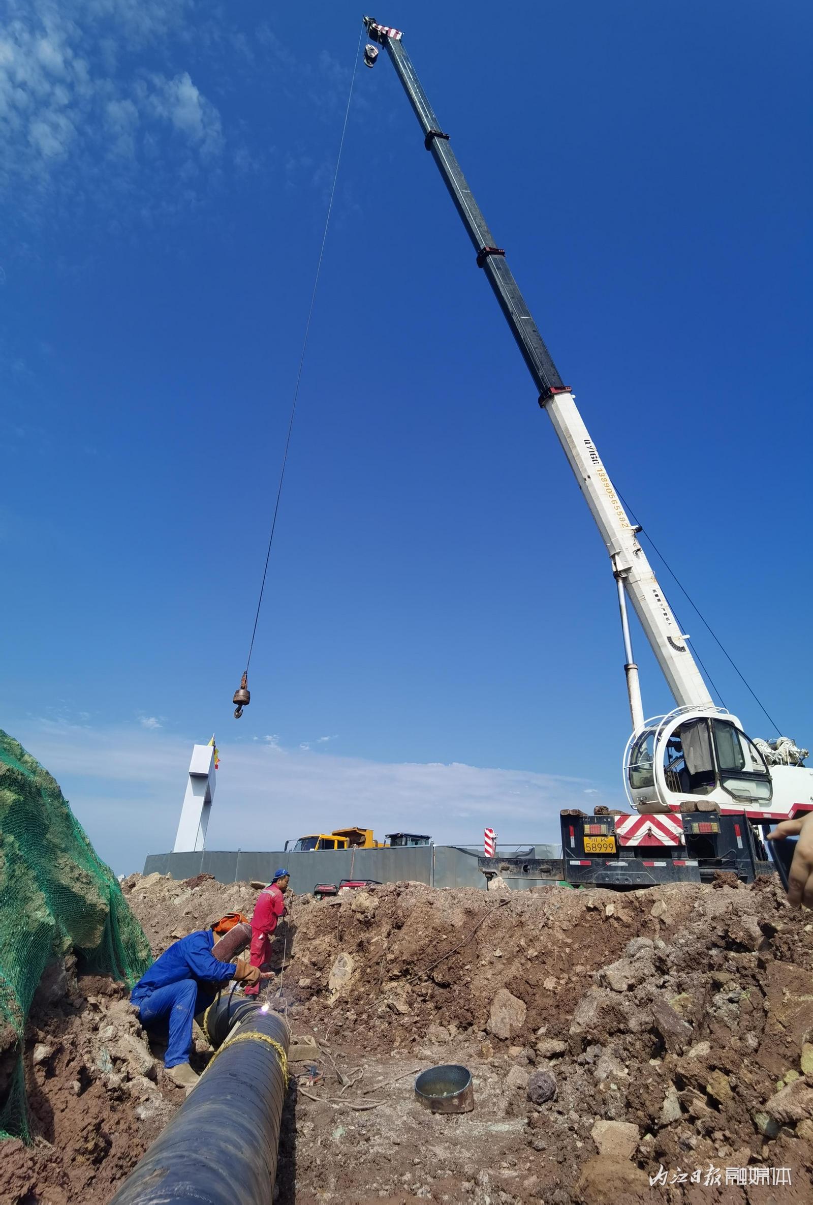 現(xiàn)場,機械聲轟鳴,大型挖掘機正在馬路邊開溝挖槽,大型吊車將管道吊到挖好的溝槽內(nèi),由施工人員逐節(jié)進行焊接……分工明確,專業(yè)有序,白晃晃的陽光下,工人們揮汗如雨,衣服早已濕透。