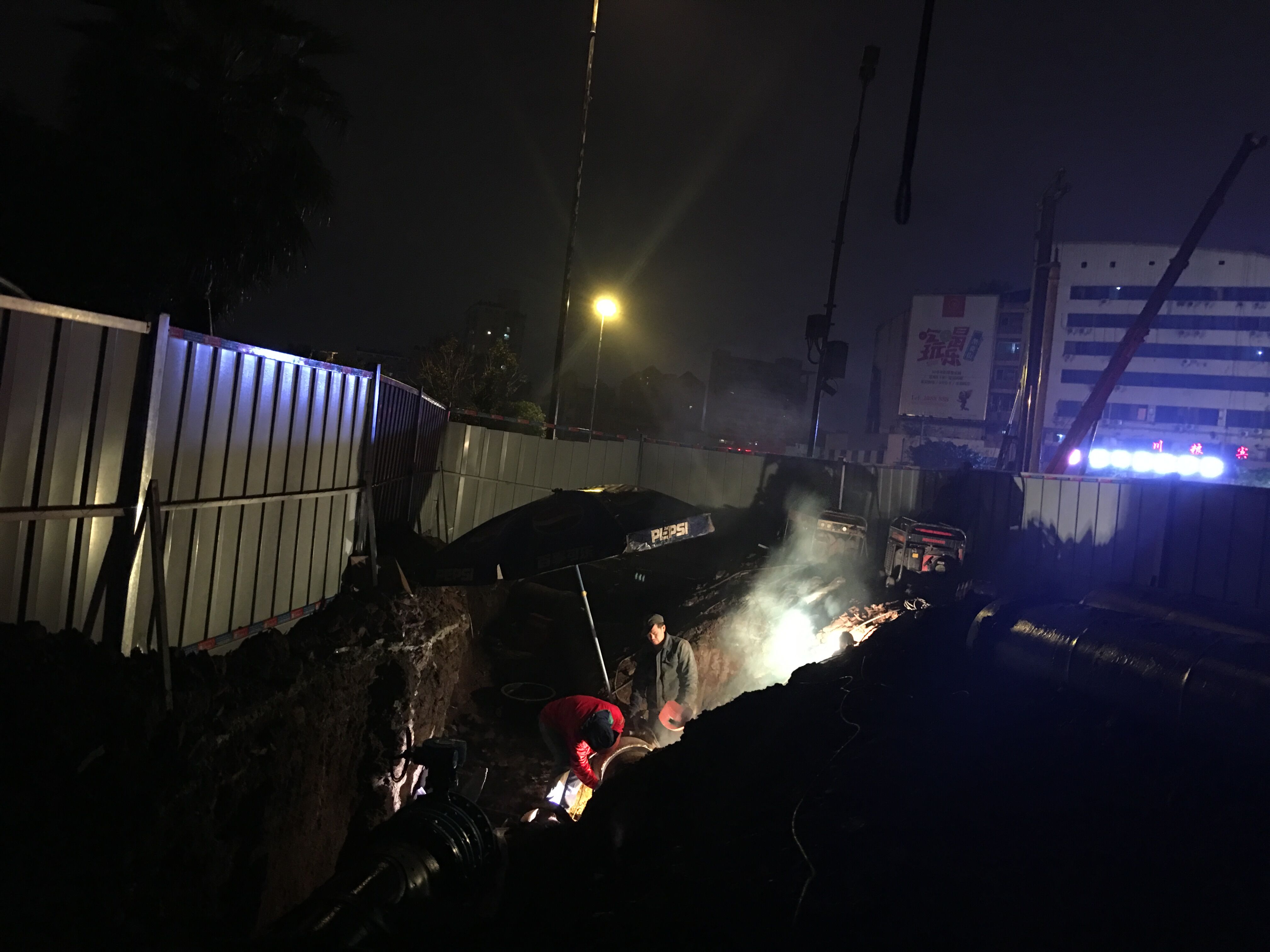 內江市水務有限責任公司為配合西林大橋南北下穿工程順利進行,積極組織豪盛安裝公司、工程管理部、管網運行部等相關部門進行西林大橋南北橋頭下穿DN500給水管道改造。為保證附近居民白天的正常用水,我司特意把工期定在晚上和凌晨。2016年11月22日晚上11點多,陰雨綿綿,寒風刺骨,公司黨委副書記、紀委書記、工會主席李濤帶領黨群工作部提上涼菜、面包和牛奶到施工現(xiàn)場慰問挑燈夜戰(zhàn)、頂風作業(yè)的加班人員。他們不畏嚴寒、不知饑餓,只為不影響居民正常生活、保證城市安全供水埋頭苦干的水務人,讓我們不得不心生敬意。
