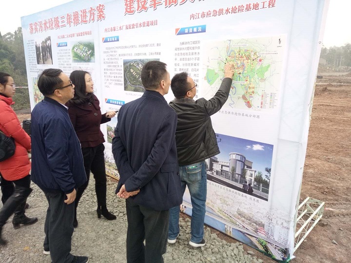 11月28日,省環(huán)境保護廳副巡視員姚東升一行到內(nèi)江,對落實污水垃圾三年推進方案落實情況進行調(diào)研。調(diào)研組先后來到了桐梓壩大橋至壽溪河口綜合環(huán)境整治工程、謝家河黑臭水體整治、東興區(qū)垃圾壓縮站及環(huán)衛(wèi)車輛專用停車場,最后來到我司第二污水處理廠建設(shè)施工現(xiàn)場進行實地調(diào)研。公司黨委副書記、紀委書記、工會主席李濤在《落實污水垃圾三年推進方案,建設(shè)幸福美麗內(nèi)江》展板前對項目推進情況作了詳細匯報,并報告了下一步工作計劃。
