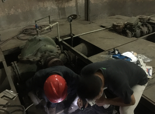 為節(jié)約生產(chǎn)成本,鍛煉員工操作技能,由二水廠(chǎng)員工負(fù)責(zé)對(duì)電機(jī)基礎(chǔ)加工改造及后續(xù)校正安裝等工作。進(jìn)入7月持續(xù)酷暑,受上游強(qiáng)降雨影響,沱江原水濁度上漲,二水廠(chǎng)在處置高濁水的間隙,趕往城區(qū)水廠(chǎng)對(duì)1#電機(jī)基礎(chǔ)的鋼板進(jìn)行焊接。深井泵房噪音大、空氣流通性差、溫度高,但維修人員不畏艱辛,身穿防護(hù)服,花費(fèi)數(shù)天時(shí)間終于完成了電機(jī)基礎(chǔ)改造工作。