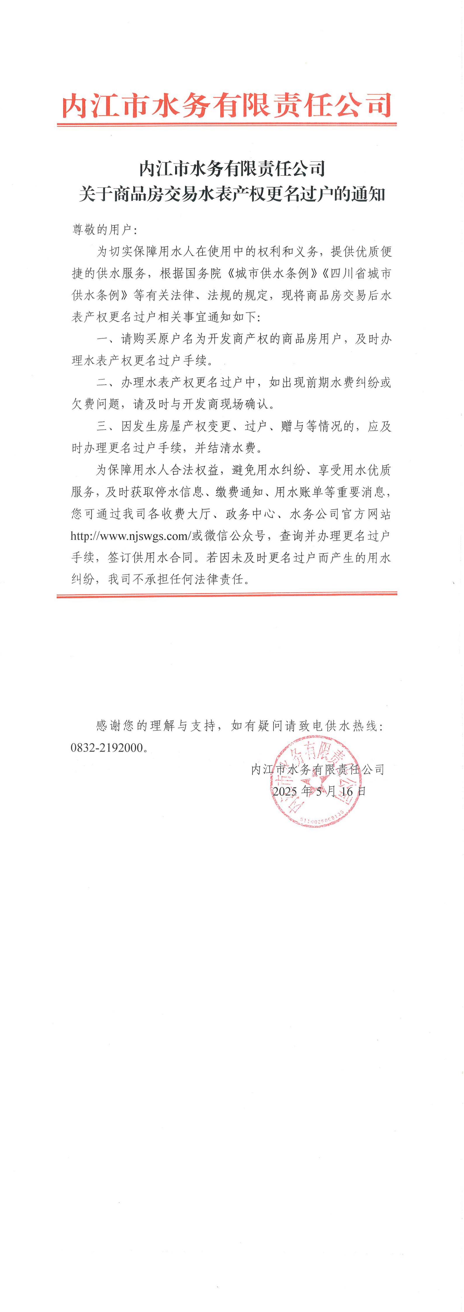 內(nèi)江市水務(wù)有限責(zé)任公司關(guān)于商品房交易水表產(chǎn)權(quán)更名過戶的通知