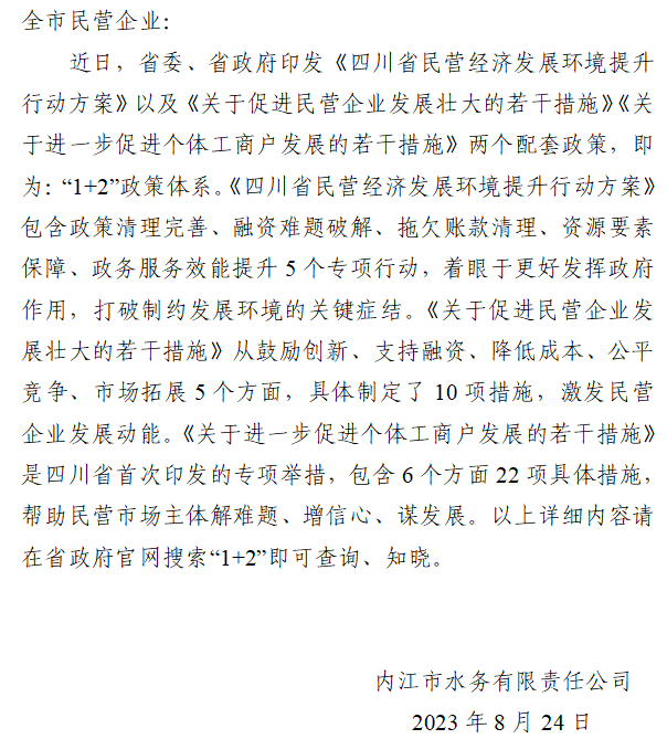 內(nèi)江市“四川省民營經(jīng)濟(jì)‘1+2’政策”告知書